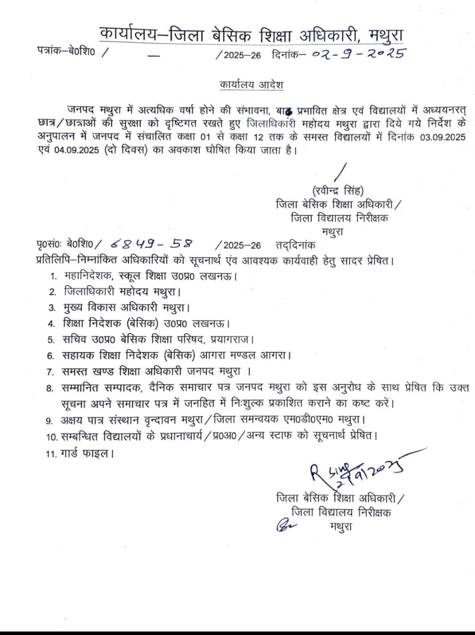 कक्षा एक से 12 तक सभी विद्यालयों की 3 और 4 सितंबर की छुट्टी घोषित Uncategorized September 2, 2025September 2, 2025News4live मथुरा। जिले में भारी वर्षा और बाढ़ के खतरे को देखते हुए कक्षा एक से 12 तक के सभी बोर्ड के स्कूल कालेजों की छुट्टी प्रशासन ने घोषित कर दी है। इसके आदेश जिला बेसिक शिक्षा अधिकारी ने जारी कर दिए हैं। Post Views: 588 Spread the love