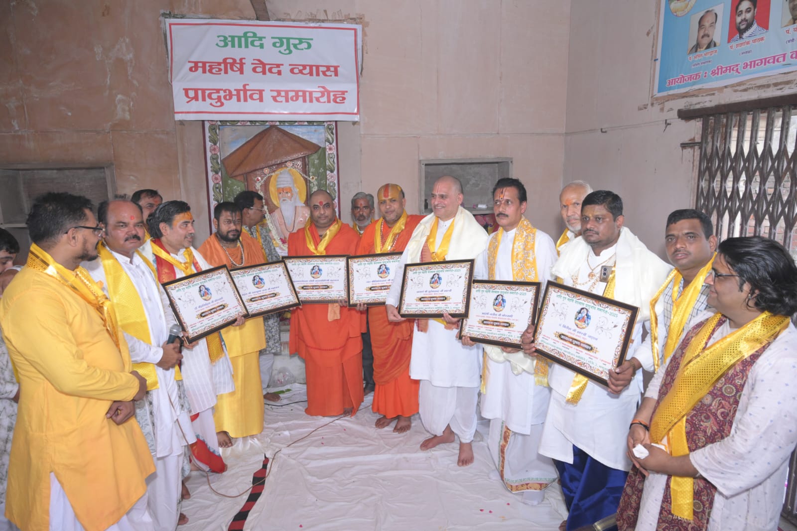 मथुरा । व्यासजी पर कथित टिप्पणी व अनर्गल प्रलाप करने वालों के प्रति निंदा प्रस्ताव पारित , आध्यात्मिक गुरुओं की महत्ता वेद व्यास से ब्रज मण्डल के विद्वानों की अग्रणी संस्था श्रीमद्भागवत कथा आयोजन समिति के तत्वावधान में मथुरापुरी स्थित महर्षि वेद व्यास की पौराणिक तपस्थली कृष्णग़ंगा घाट स्थित वेद व्यास मंदिर पर आदिगुरु महर्षि वेद व्यास प्रादुर्भाव समारोह का आयोजन विगत अनेक वर्षों की भांति परंपरागत रूप से मनाया गया। जिसमें सर्वप्रथम वेद मंत्रों के मंत्रोच्चारण के मध्य, विद्वतजन, पांडित्यजन व आध्यात्मिक गुरुजनों ने आदिगुरु का चरणाभिषेक कर पूजन अर्चन किया गया, तदोपरांत समिति संस्थापक पंडित अमित भारद्वाज, अध्यक्ष पंडित शशांक पाठक, आचार्य रमाकांत गोस्वामी व स्मारक समिति के योगेश आवा , संयोजक आचार्य शिवओम गौड़ शास्त्री ने मंगल दीप प्रज्ज्वलित कर समिति संस्थापक पंडित अमित भारद्वाज की अध्यक्षता में विद्वत संगोष्ठी का आयोजन हुआ । संगोष्ठी में व्यासजी के जीवन दर्शन पर विद्वानों ने प्रकाश डाला । इस अवसर पर ब्रज भक्त व समारोह के सलाहकार आचार्य रमाकांत गोस्वामी ने कुमार विश्वास व संपूर्णानंद विश्वविद्यालय के कुलपति व काशी विद्वत परिषद के महामंत्री द्वारा सनातन धर्म के सूत्रधार व्यासजी के संदर्भ में कथित टिप्पणी व अनर्गल प्रलाप के अशोभनीय कृत्य पर निंदा प्रस्ताव पारित किया जिसका उपस्थित समस्त विद्वानों व धर्मगुरुओं द्वारा सहमति प्रदान प्रदान कर भर्त्सना की गई । विद्वानों ने कहा कि जिसने सनातन धर्म की नींव रखी उसके प्रति इस प्रकार की अमर्यादित टिप्पणी को बर्दाश्त नहीं किया जायेगा। समारोह में ब्रजमंडल के 11 विद्वानों डा. हरिमोहन गोस्वामी, संत निर्मलदास महाराज, आचार्य अनिल स्वामी, नवीन गोस्वामी, पं. सुरेश चंद्र शास्त्री, महंत रामकृष्ण दास महाराज, गिरीश शास्त्री, महामंडलेश्वर नवलगिरी महाराज आदि को अध्यात्म भूषण की उपाधि से दुशाला ओढ़ाकर व सम्मान पत्र प्रदान कर अध्यात्म भूषण की उपाधि से अलंकृत किया गया । इस अवसर पर प्रमुख रूप से आचार्य विष्णुशरण भारद्वाज, आचार्य नंदकिशोर, बलराम आचार्य हरिशंकर शास्त्री , राधावल्लभ शास्री लालजीभाई शास्त्री , मुरारीलाल उपाध्याय, यज्ञदत्त शास्त्री महेंद्रदत्त आचार्य, पंकज शर्मा, रमेश चंद्र शर्मा आदि सहित ब्रजमंडल के संत, महंत व विद्वतजन उपस्थित हुए।