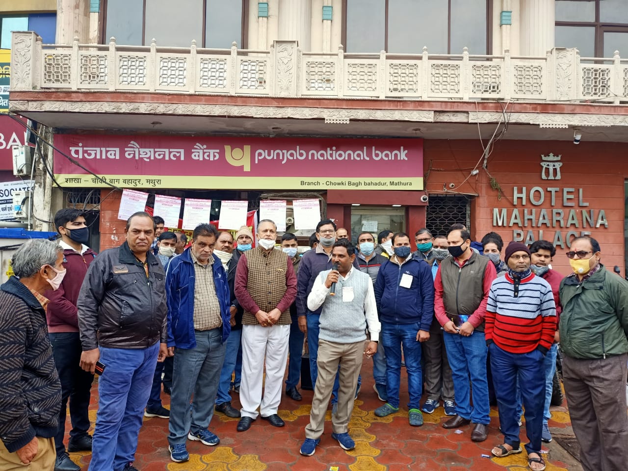 मथुरा । गुरुवार को ऐआईबीईऐ एवं यूपी बैंक एम्प्लाइज यूनियन के आव्हान पर सुबह 10:30 बजे पंजाब नेशनल बैंक शाखा चौकी बाग बहादुर पर जिले भर के बैंक कर्मचारी एलआईसी के कर्मचारी एकत्रित हुए तथा सरकार की किसान विरोधी कर्मचारी विरोधी बैंक निजीकरण के विरोध में जोरदार नारेबाजी कर अपना विरोध प्रकट किया।