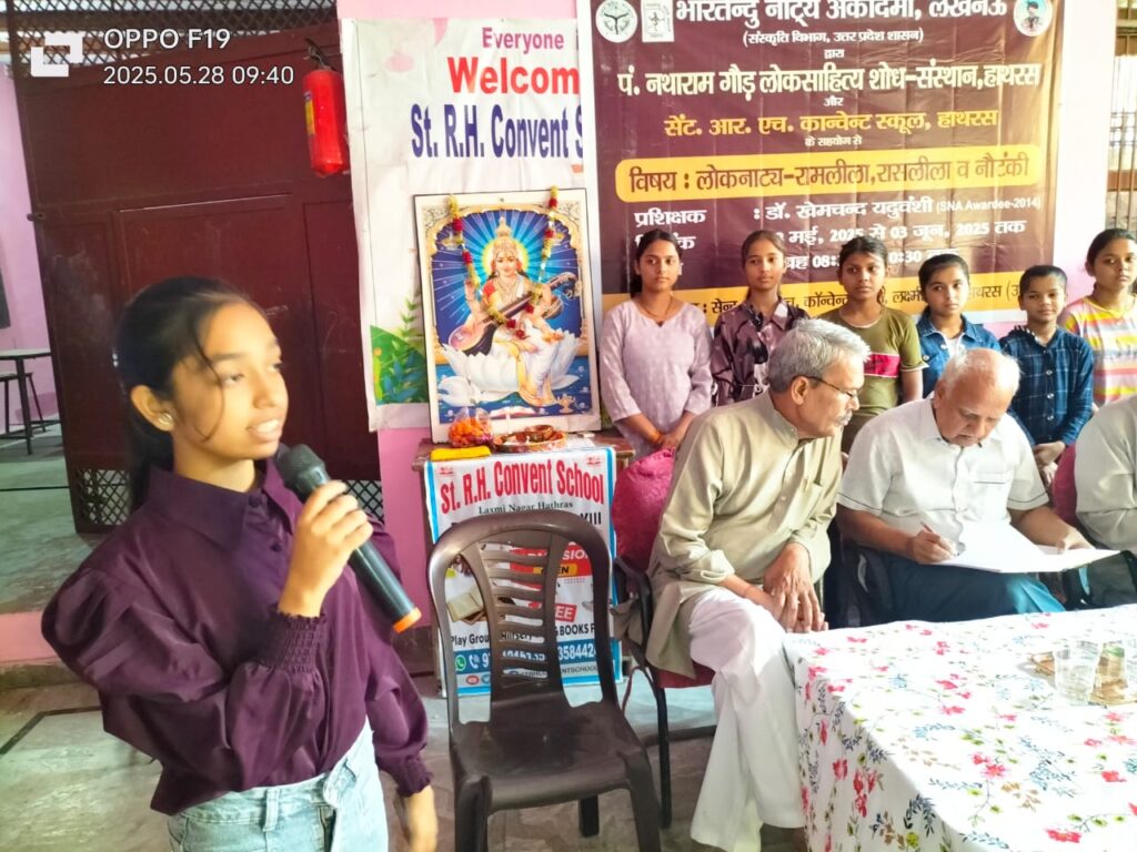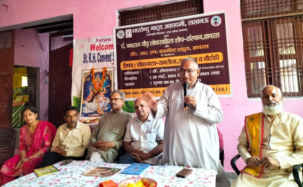 हाथरस। भारतेन्दु नाट्य अकादमी, सँस्कृति विभाग लखनऊ के द्वारा पं. नथाराम गौड़ लोकसाहित्य शोध-संस्थान (रजि.) के सहयोग से शहर के लक्ष्मी नगर स्थित सेन्ट. आर. एच. कॉन्वेन्ट स्कूल परिसर में 7 दिवसीय लोकनाट्य- रामलीला,रासलीला व नौटंकी प्रशिक्षण शिवर का समारोह पूर्वक आगज़ हो चुका है जिसकी अध्यक्षता विद्यालय के प्रबंधक एडवोकेट अजय किशोर गौड़ ने की। इस अवसर पर मुख्य अतिथि के रूप में योगाचार्य पं. रूप राम शर्मा तथा विशिष्ट अतिथि स्वरूपेण