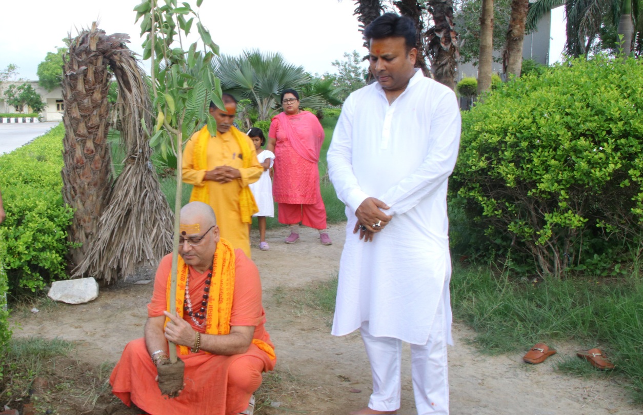 चित्र परिचयः संस्कृति विवि में चातुर्मास व्रत व्यास पूजा के दौरान जगद्गुरु शंकराचार्य अनन्तश्री स्वामी अमृतानंद देवतीर्थ महास्वामी पौधे का रोपण करते हुए, साथ में हैं संस्कृति विवि के कुलाधिपति डा. सचिन गुप्ता।