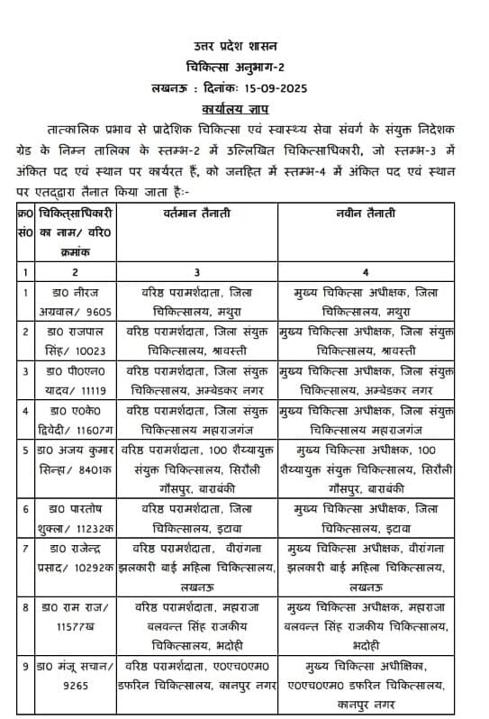 डा.मुकुंद बंसल के सेवानिवृत्त होने के बाद डा.नीरज कार्यवाहक सीएमएस के रूप से कार्य कर रहे थे। शासन के आदेश जारी होने के बाद चिकित्सकों एवं कर्मचारियों ने उनको बधाई देना शुरू कर दिया है। वहीं डा.राजपाल को श्रावस्ती,डा.पीएन यादव को अम्बेडर नगर, डा.एके द्विवेदी को महाराजगंज,अजय कुमार सिंहा को 100 शैय्यायुक्त संयुक्त चिकित्सालय सिरौली गौसपुर बाराबंकी, डा.पारतोष शुक्ला को इटावा, डा.राजेन्द्र प्रसाद को वीरांगना झलकारी बाई महिला चिकित्सालय,लखनऊ,डा.रामराज को भदोही और डा.मंजू सचान को एएचएम डरफिन चिकित्सालय कानपुर का सीएमएस बनाया है।