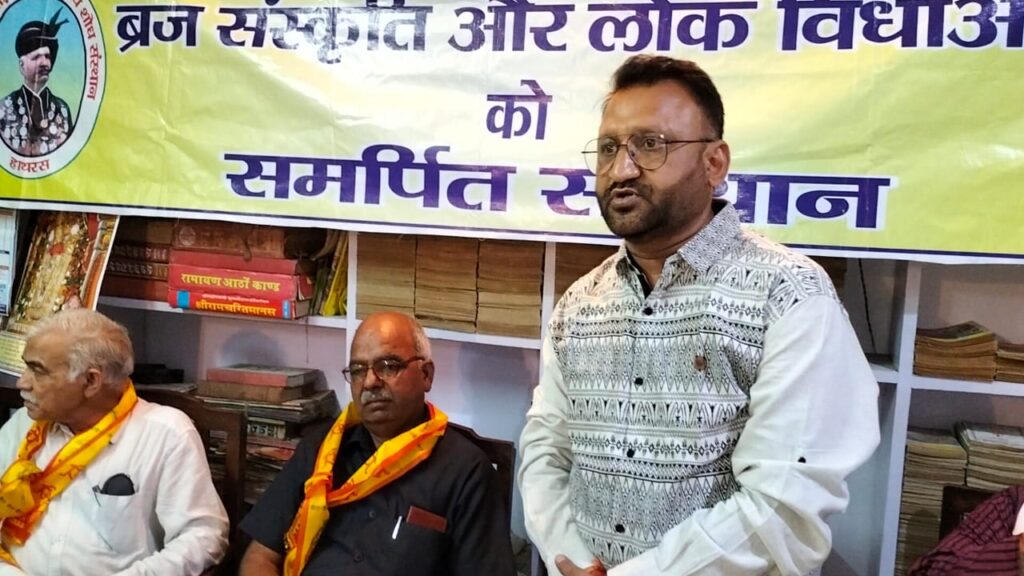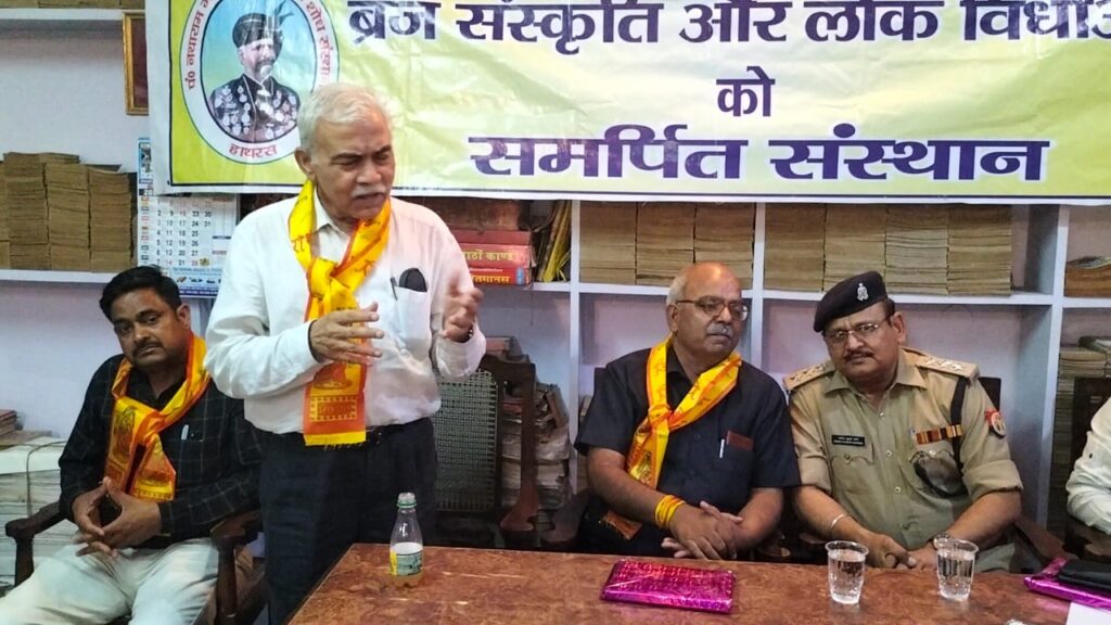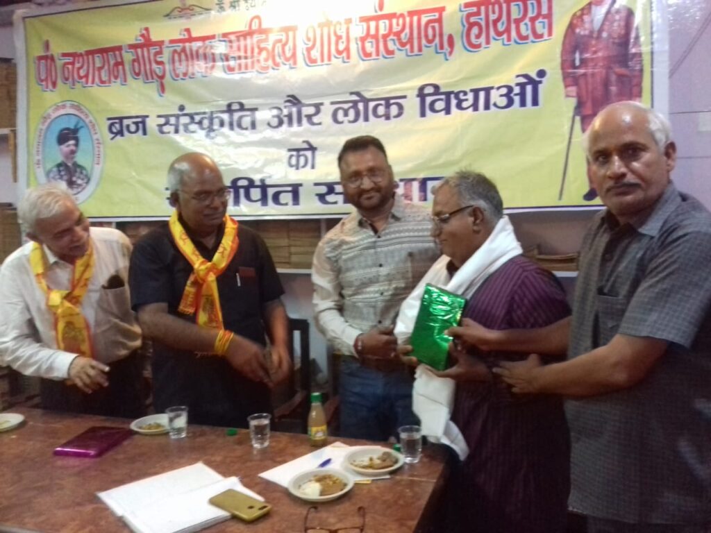 मथुरा। ‘प. नथाराम लोकसाहित्य शोध-संस्थान, हाथरस’ तथा ‘ब्रज संस्कृति केंद्र’ मथुरा’ के संयुक्त तत्वावधान में हाथरसी स्वांग के युगपुरुष पंडित नथाराम गौड़ की 80 वीं पुण्यतिथि पर ‘कृतज्ञताअनुष्ठान: भावांजलि- 2022’ का आयोजन श्याम-प्रेस परिसर में आयोजित किया गया। जिसकी अध्यक्षता संस्था के अध्यक्ष प.आशीष गौड़ द्वारा की गई तथा मुख्य अतिथि के रूप में जिला उपभोक्ता संरक्षण आयोग के सदस्य श्रीकृष्ण प्रभाकर उपध्य्याय उपस्थित रहे।