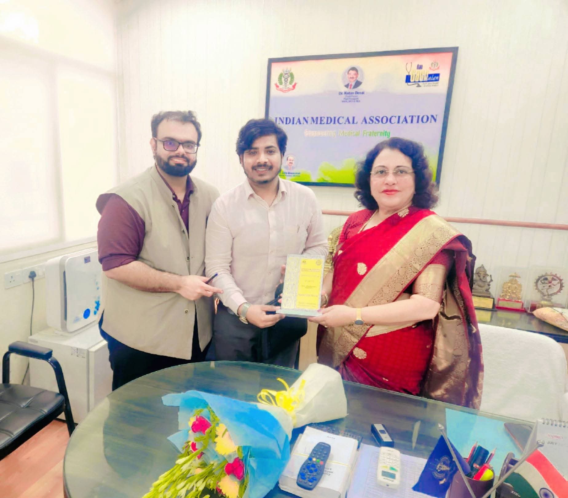 फोटो- दिल्ली में आयोजित बैठक में मथुरा के डा. सिद्धार्थ धनगर को आईएमए एप्रिसिएशन अवार्ड देते हुए आईएमए की सेक्रेटरी जनरल डा.सरबरी दत्ता एवं नेशनल कंवेनर डा.करन जुनेजा