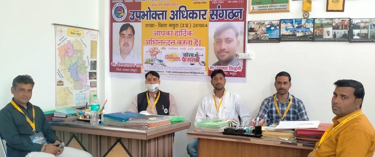 मथुरा। उपभोक्ता अधिकार संगठन के मुख्य कार्यालय बी.एस.ए.रोङ सुखदेव नगर मथुरा पर होली के पावन पर्व को लेकर “राष्ट्रीय अभियान ग्राहक बोलेगा”के तहत “उपभोक्ताओं को जागरूक” करने के उद्देश्य से सोशल डिस्टेनश का पालन करते हुये एक बैठक का आयोजन किया गया। बैठक की अध्यक्षता जिलाध्यक्ष प्रेमनारायण शर्मा ने की और कहा कि कालाबाजारी करने वाले कुछ व्यापारियों द्वारा लाॅकडाउन कि अफवाह फैलाकर गुटखा,बीङी,सिगरेट आदि का अवैध भण्डारण कर उपभोक्ताओं से अंकित मूल्य से ज्यादा मूल्य ले रहे हैं, ऐसे लोगों की जानकारी कर मथुरा जिलाधिकारी जी को अवगत कराकर कानूनी कार्यवाही कराई जायेगी।