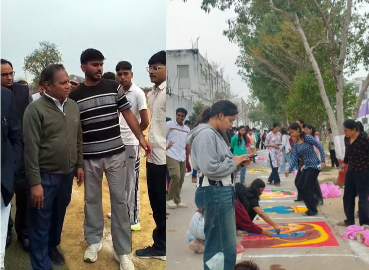 मथुरा। केएम विश्वविद्यालय के कृदय-2.0 वार्षिकोत्सव में खेलों के धमाल में सांस्कृतिक कार्यक्रम में प्रतिभाग करने वाले छात्र-छात्राओं का उत्साह देखने लायक है। विश्वविद्यालय और मेडीकल कालेज के छात्रों के बीच जबरदस्त मुकाबला देखने के मिल रहा है। विवि के कुलाधिपति किशन चौधरी ने फुटबॉल खेल (फाइनल) का शुभारंभ खिलाड़ियों का परिचय व फुटबाल में जोरदार किक मारकर किया। इसके अलावा अन्य खेलों का शुभारंभ कुलपति डा. एनसी प्रजापति, कुलसचिव डा. पूरन सिंह ने खिलाड़ियों से हाथ मिलाकर उनका परिचय लेते हुए उनका उत्साहवर्धन किया। इसी श्रृंखला में कृदय-2.0 वार्षिकोत्सव पर विवि के परिसर में रंगोली प्रतियोगिता में छात्रों ने रंगीन और स्वास्थ्य-विषयक रंगोली बनाकर अपनी कला का प्रदर्शन किया। फूलों की पंखुड़ियों, रंगीन पाउडर, चावल के दानों और दीयों का उपयोग करके उन्होंने विश्वविद्यालय प्रांगण को कला और संस्कृति के एक अद्भुत प्रदर्शन में बदल दिया। इस अवसर पर उपस्थित चिकित्सा विशेषज्ञों और चिकित्सकों ने छात्रों की रचनात्मकता, जटिल डिज़ाइन और जीवंत रंगों की जमकर प्रशंसा की। यह प्रतियोगिता सांस्कृतिक गौरव के साथ-साथ स्वास्थ्य के प्रति जागरूकता फैलाने का माध्यम बनी। वहीं दूसरी ओर फुटबाल प्रतियोगिता खो-खो प्रतियोगिता में गर्ल्स मेडीकल और यूनीवर्सिटी के बीच मुकाबला हुआ, जिसकी प्रशंसा कुलसचिव डा. पूरन सिंह करते हुए छात्राओं का मनोबल बढ़ाया। कुलसचिव डा. पूरन सिंह ने बताया कृदय 2.0 वार्षिकोत्सव की प्रतियोगिताएं अंतिम पड़ाव पर पहुंच चुकी है, मेडीकल-विश्वविद्यालय की टीम के बीच क्रिकेट, फुटबॉल, बास्केटबॉल, बॉलीवाल, दौड़, भाला फेंक, लम्बी कूद, कबड्डी, खो-खो, बैडमिंटन, शतरंज, कैरम, बीजीएमआई और 8 बॉल पूल, रंगोली, टी शर्ट पेंटिंग मेंहदी और फेस पेंटिंग, एक प्रश्नोत्तरी, बिना आग के खाना पकाना, खजाने की खोज और मूक अभिनय, एक बहस, भीख मांगना, उधार लेना और चोरी जैंसे कम्पटीशन हो रहे है, स्क्विड गेम्स और डीजे नाइट के साथ कृदय-2.0 का समापन होगा। सभी विजेता खिलाड़ियों को ट्राफी, शिल्ड, प्रमाण पत्र देकर सम्मानित किया जाएगा।