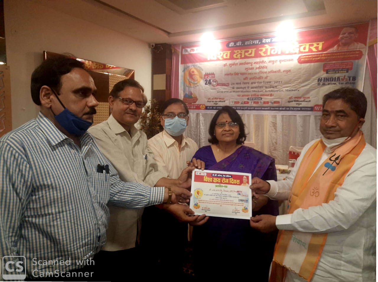 होटल माधव मुस्कान में आयोजित क्षय रोग दिवस कार्यक्रम का शुभारम्भ मथुरा-वृन्दावन के मेयर डा. मुकेश आर्यबन्धु, संयुक्त निदेशक स्वास्थ्य डॉ गुप्ता, मुख्य चिकित्साधिकारी डा. रचना गुप्ता, जिला क्षय रोग अधिकारी डा. संजीव यादव ने किया।