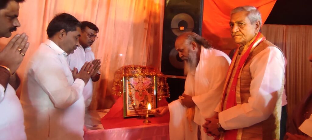 इससे पूर्व मां भगवती के चित्रपट के सम्मुख दीप प्रज्वलित कर मंत्री लक्ष्मी नारायण चौधरी सहित अन्य अतिथियों ने माँ भगवती के चित्रपट के समक्ष संयुक्त रूप से दीप प्रज्वलित कर समारोह का शुभारंभ किया। सभी अतिथियों का समिति पदाधिकारियों द्वारा पटका पहनाकर और स्मृति चिन्ह भेंट कर स्वागत किया गया।