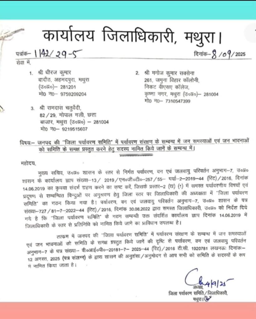 मनोज कुमार सक्सेना पूर्व से ही अनेक सामाजिक संगठनों, सेवा, धार्मिक अनुष्ठानों व विभिन्न प्रकल्पों में सक्रिय सकारात्मक भूमिका में रहे हैं । रामदास चतुर्वेदी नगर निगम मथुरा वृंदावन से निवर्तमान पार्षद एवं ब्रज पर्यावरण संरक्षण परिषद मथुरा के महामंत्री है। जो कि लगभग 22 वर्ष से विभिन्न प्रकार से पर्यावरण संरक्षण के लिए कार्यरत है। एक उर्जावान पार्षद के रूप में नगर निगम की समस्याओं का निराकरण, समाधान व जन सुविधाओं को करने में सेवा करते रहे हैं। दोनों को जिला पर्यावरण समिति का सदस्य नियुक्त किया है। नवनियुक्त सदस्य श्री मनोज कुमार सक्सेना ने कहा कि उनकी प्राथमिकता ब्रज से वृक्षों को जैसे करील वन,जर बेरिया,फर्राश,ऊर्रु कदम, आदि वृक्षों का संरक्षण कराने का प्रयास करेंगे। झाड़ियां को लगवाने से पक्षियों को संरक्षण मिलता है। वह उसमें अपना निवास बनाते हैं साथ ही साथ तालाबों के किनारे अत्यधिक मात्रा में व ग्राम समाज की रिक्त पड़ी भूमियों पर वृक्षारोपण भी कराया जाएगा। उनका संरक्षण ग्राम प्रधान व ग्राम सभा को सोपे जाने का प्रयास शासन के माध्यम से कराएंगे। जिलाधिकारी महोदय के माध्यम से शासन तक अपनी ब्रज की समस्याओं, पर्यावरण प्रदूषण से संबंधित का काम भी किया जाएगा। रामदास चतुर्वेदी ने कहा कि यह ब्रज मंडल चौरासी कोसी तीर्थ क्षेत्र एक अलौकिक देव भूमि है, यहां के वन,उपवन,कुंड सरोवरों का संरक्षण,यमुना जी की निर्मल और अविरल धारा के लिए जन जागरण और कार्य करना मेरी प्राथमिकता रहेगी।