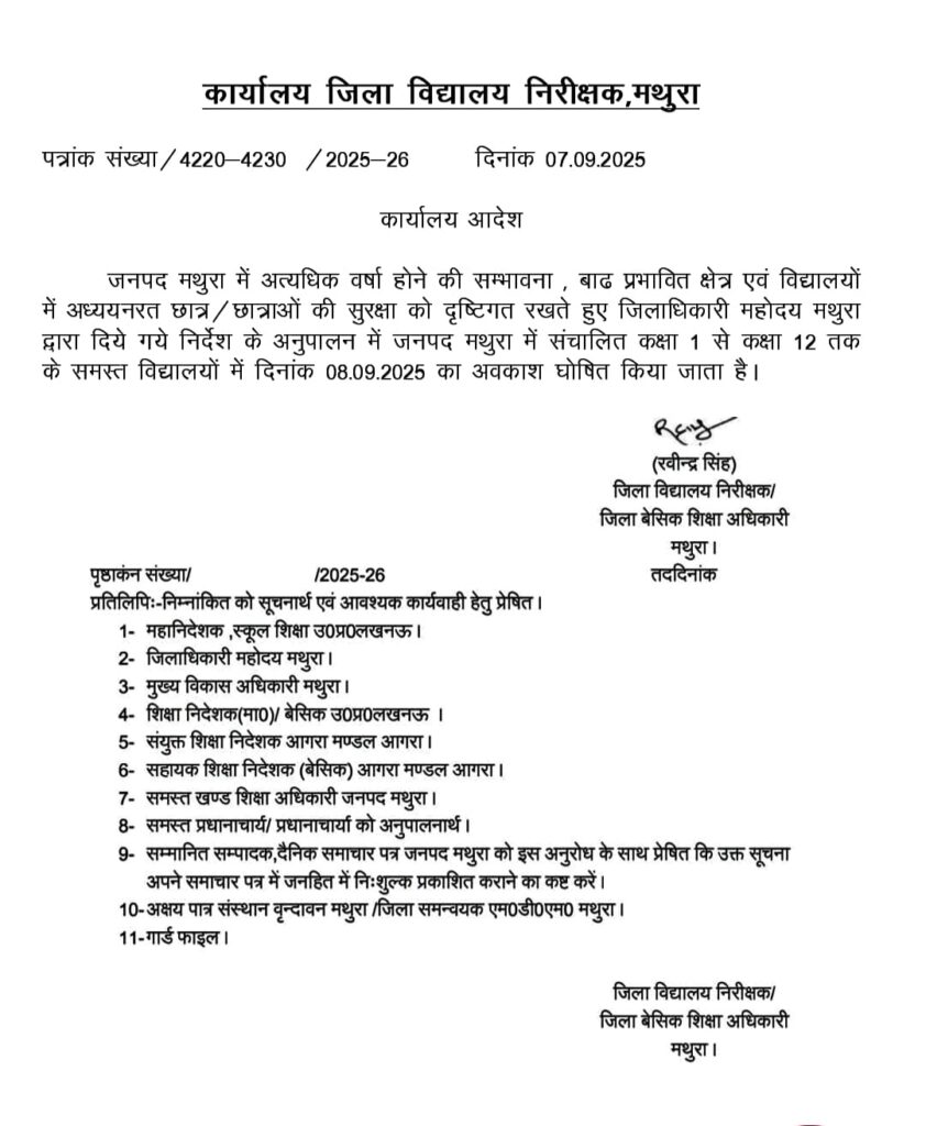 08 सितंबर 2025 को स्कूलों की छुट्टी घोषित Uncategorized September 7, 2025September 7, 2025News4live मथुरा । जिला विद्यालय निरीक्षक/प्रभारी जिला बेसिक शिक्षा अधिकारी रविन्द्र सिंह ने अवगत कराया है कि जिलाधिकारी महोदय के निर्देशों के क्रम में कक्षा 1 से 12 तक के सभी विद्यालयों में दिनांक 08 सितंबर 2025 का अवकाश घोषित किया गया है। Post Views: 376 Spread the love