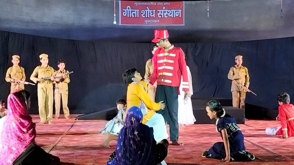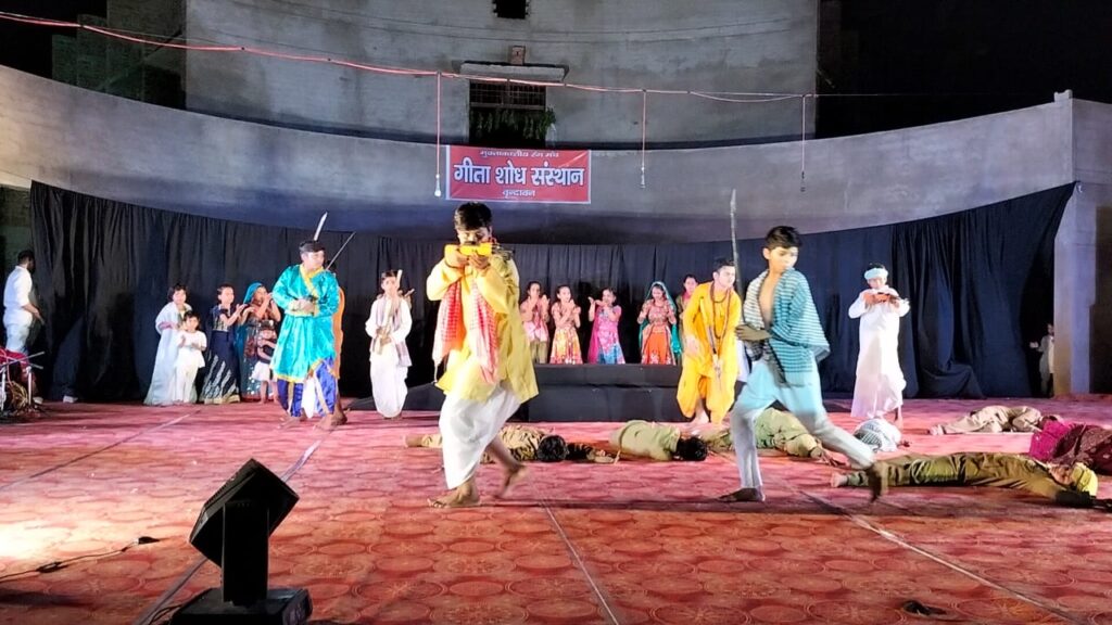 बुधवार सांय यह भव्य मंचन बाल रंग कार्यशाला के समापन पर वृंदावन के गीता शोध संस्थान परिसर के मुक्ताकाशीय रंगमंच पर हुआ। मंचन का शुभारंभ जीएलए विश्वविद्यालय के कुलाधिपति श्री नारायण दास अग्रवाल, उत्तर प्रदेश ब्रज तीर्थ विकास परिषद के मुख्य कार्यपालक अधिकारी नगेंद्र प्रताप, उप मुख्य कार्यपालक अधिकारी पंकज वर्मा और मथुरा-वृंदावन विकास प्राधिकरण के विशेष कार्याधिकारी क्रांति शेखर सिंह ने संयुक्त रूप से दीप प्रज्ज्वलित कर और भगवान श्री कृष्ण की प्रतिमा पर माल्यार्पण कर किया।