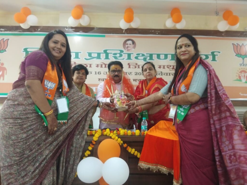 मथुरा। महिला मोर्चा जिला प्रशिक्षण वर्ग का आयोजन पुष्पांजलि उपवन स्थित भाजपा कार्यालय में जिला अध्यक्ष मुदिता शर्मा के नेतृत्व में किया गया। उद्घाटन के प्रथम सत्र में मुख्य वक्ता के रूप में विजय बहादुर पाठक प्रदेश उपाध्यक्ष भारतीय जनता पार्टी प्रभारी महिला मोर्चा रहे। उन्होंने बताया कि भारतीय जनता पार्टी का इतिहास संघर्षपूर्ण रहा। आज हम विश्व की सबसे बड़ी पार्टी बनकर उभरे हैं, उसमें दीनदयाल उपाध्याय जी श्यामा प्रसाद मुखर्जी जैसे महान कार्यकर्ताओं ने अपने रक्त से सिंचित कर बनाया है ।